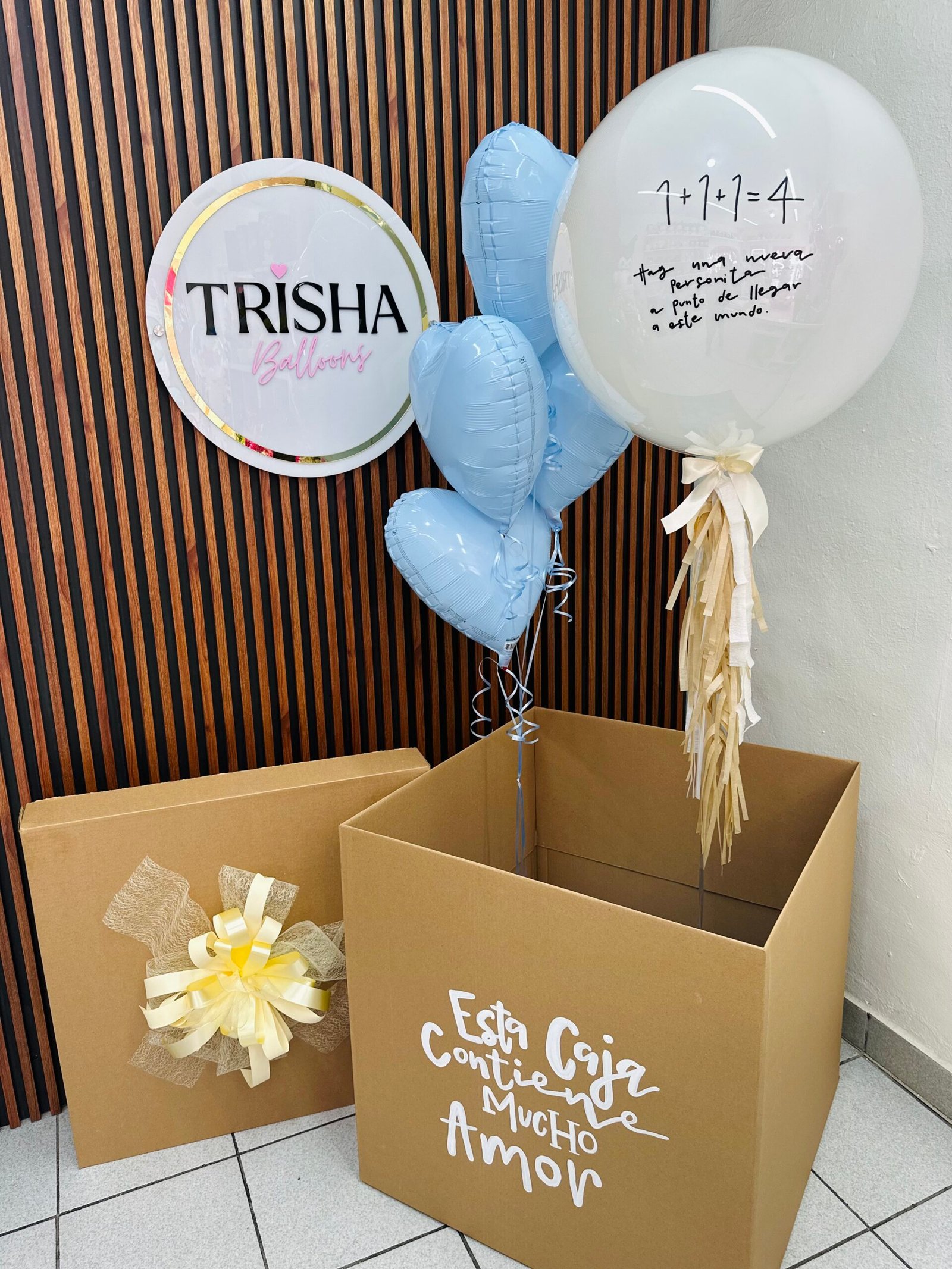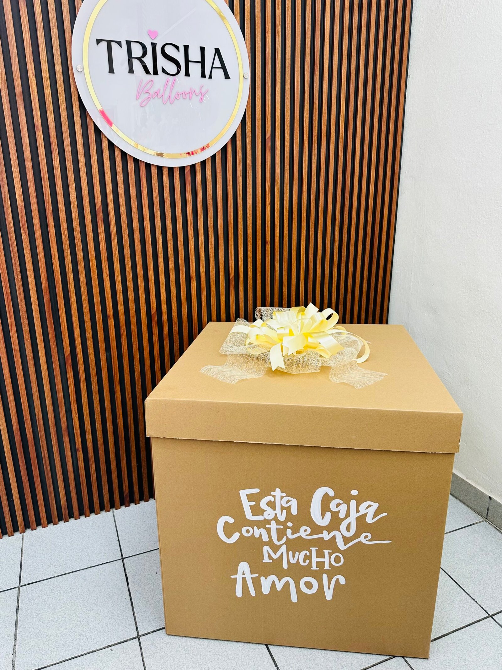 Caja revelación en tono Kraft, englobado burbuja 24″, 4 corazones 18″, moño en tapa (M)