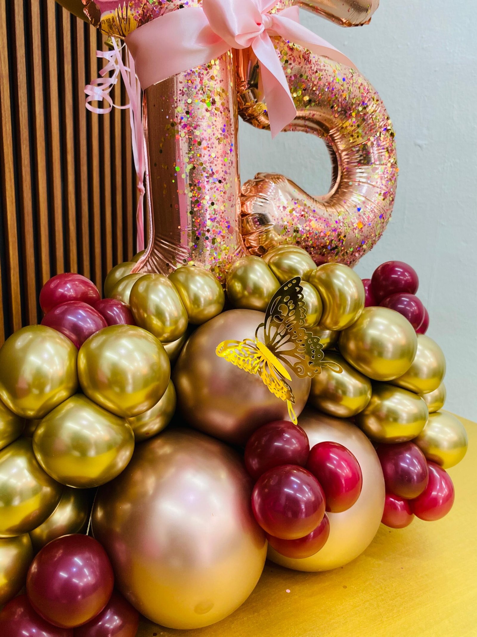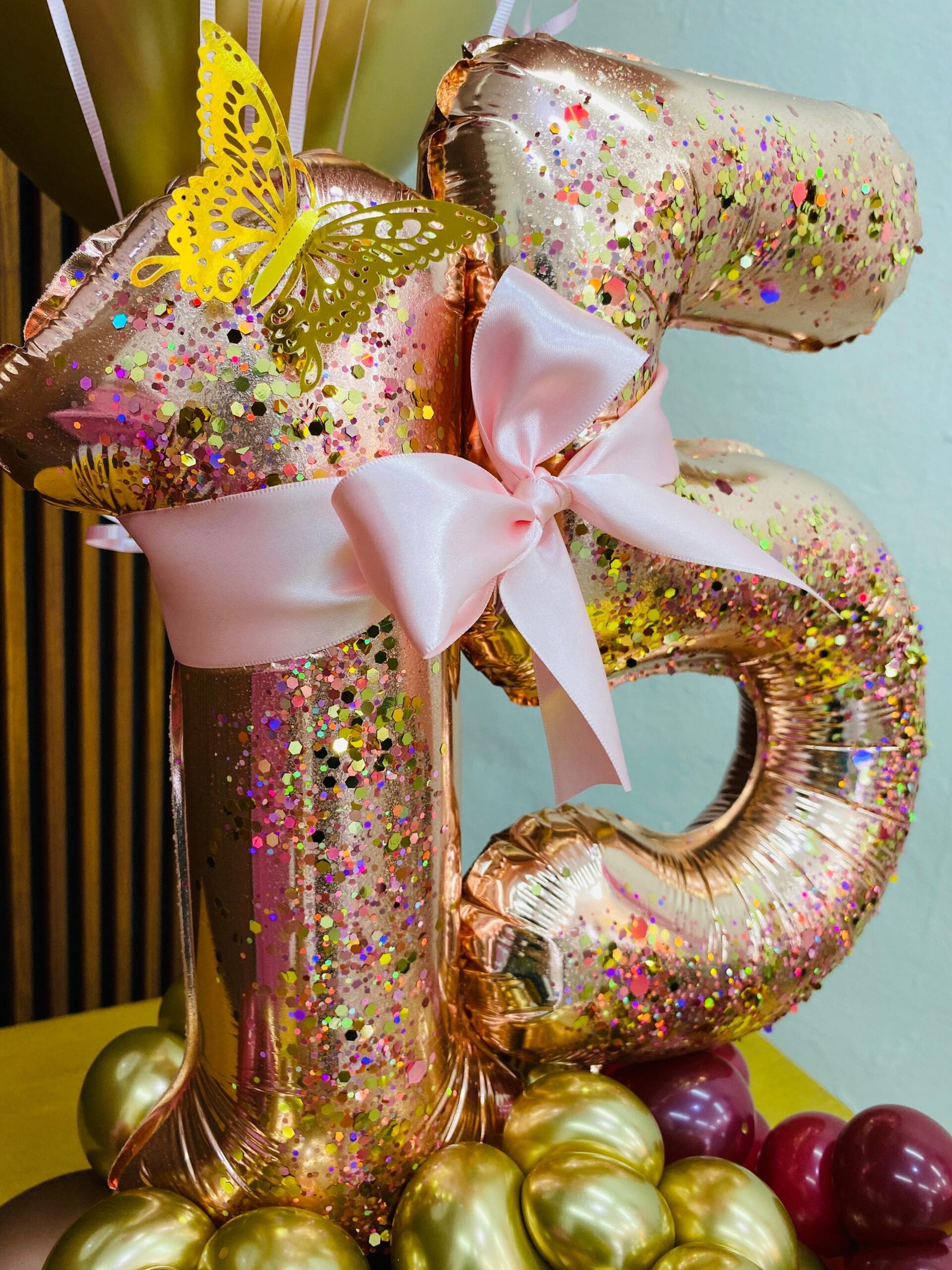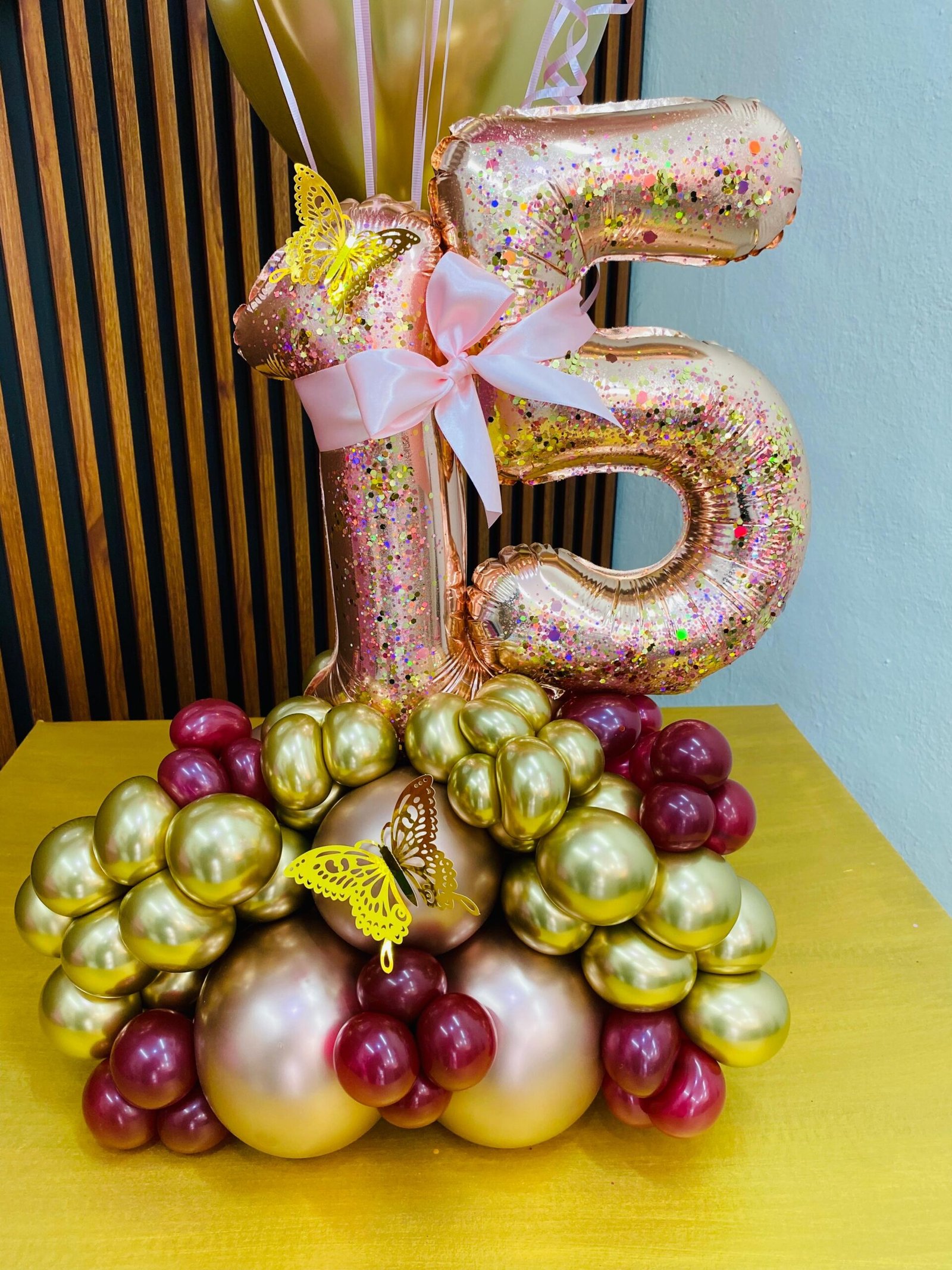 Caja personalizada XV 75×75, base en tapa globos látex con par de números foil 14″ con detalles en purpurina, bouquet de globos foil y látex con helio
