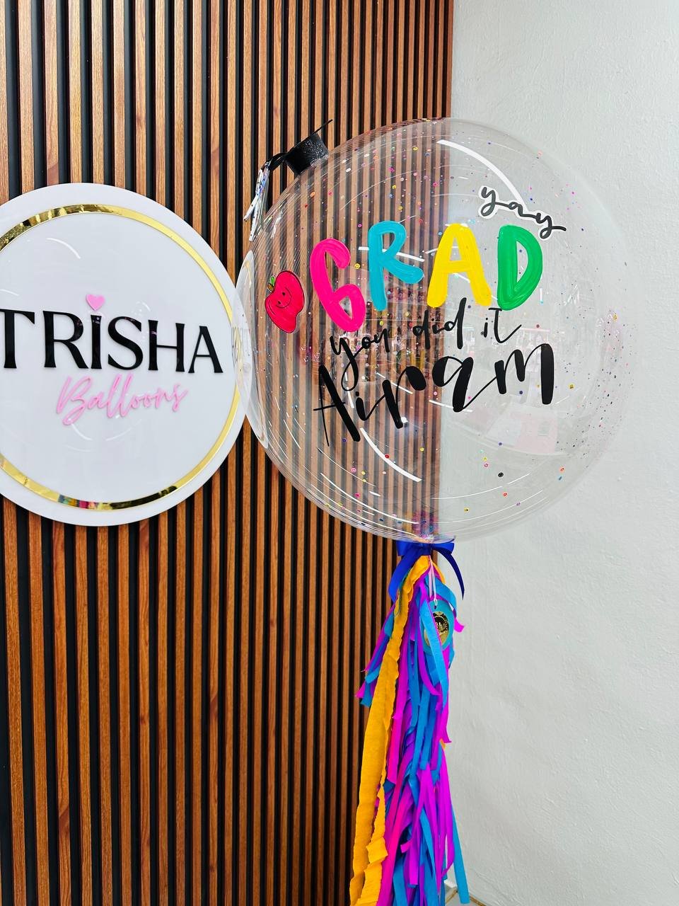 Burbuja personalizada con detalles de purpurina, texto GRAD en color