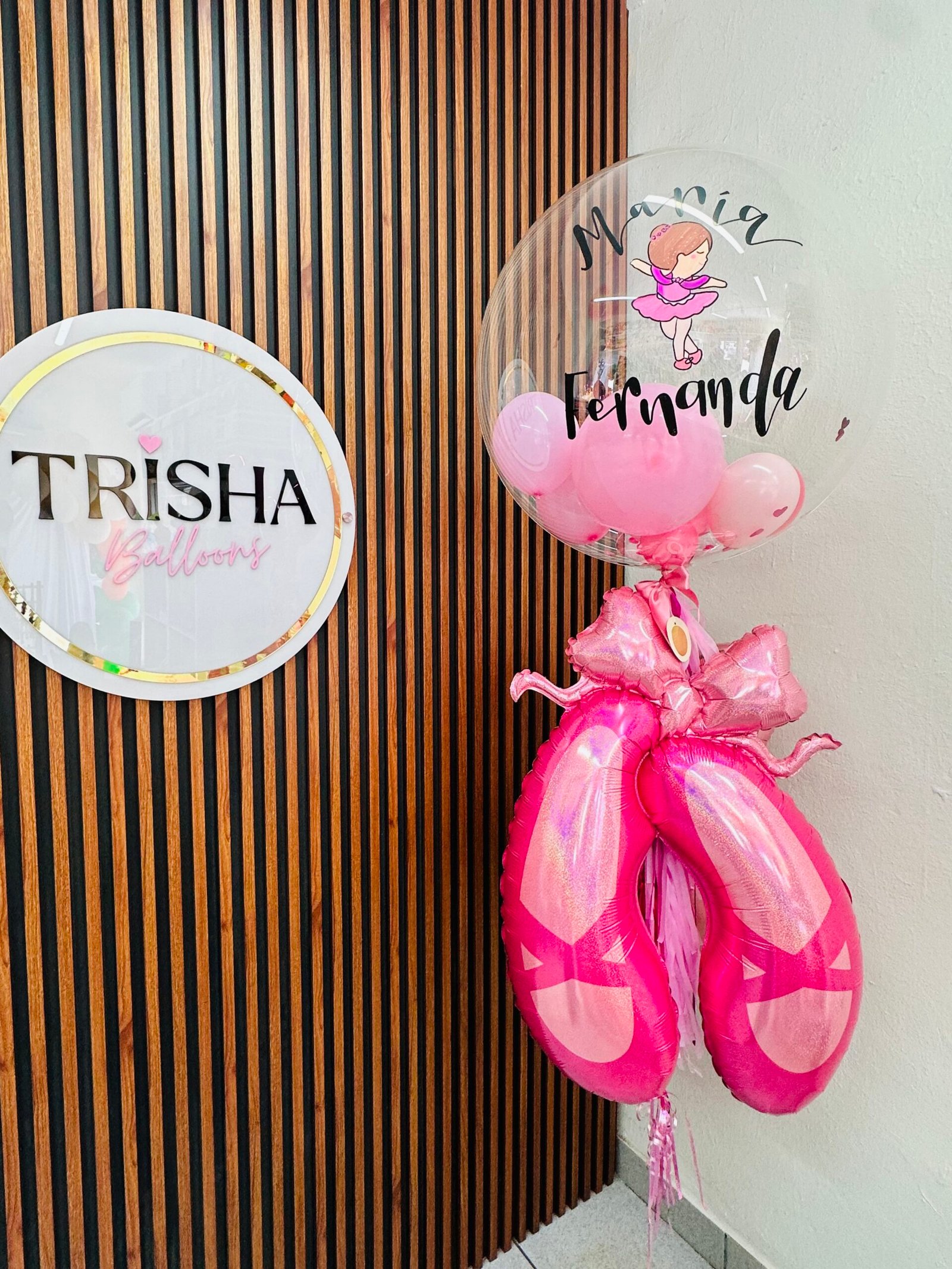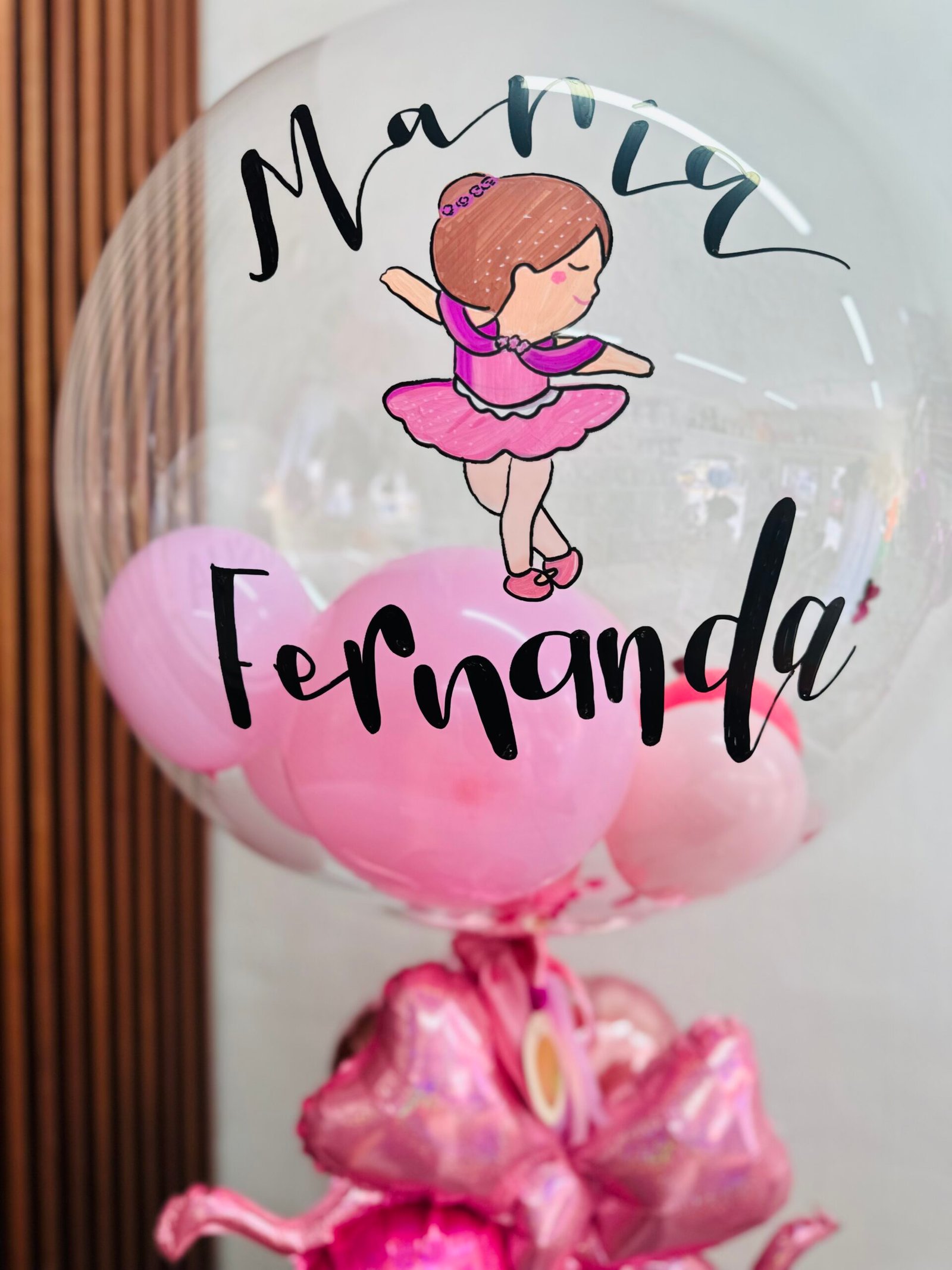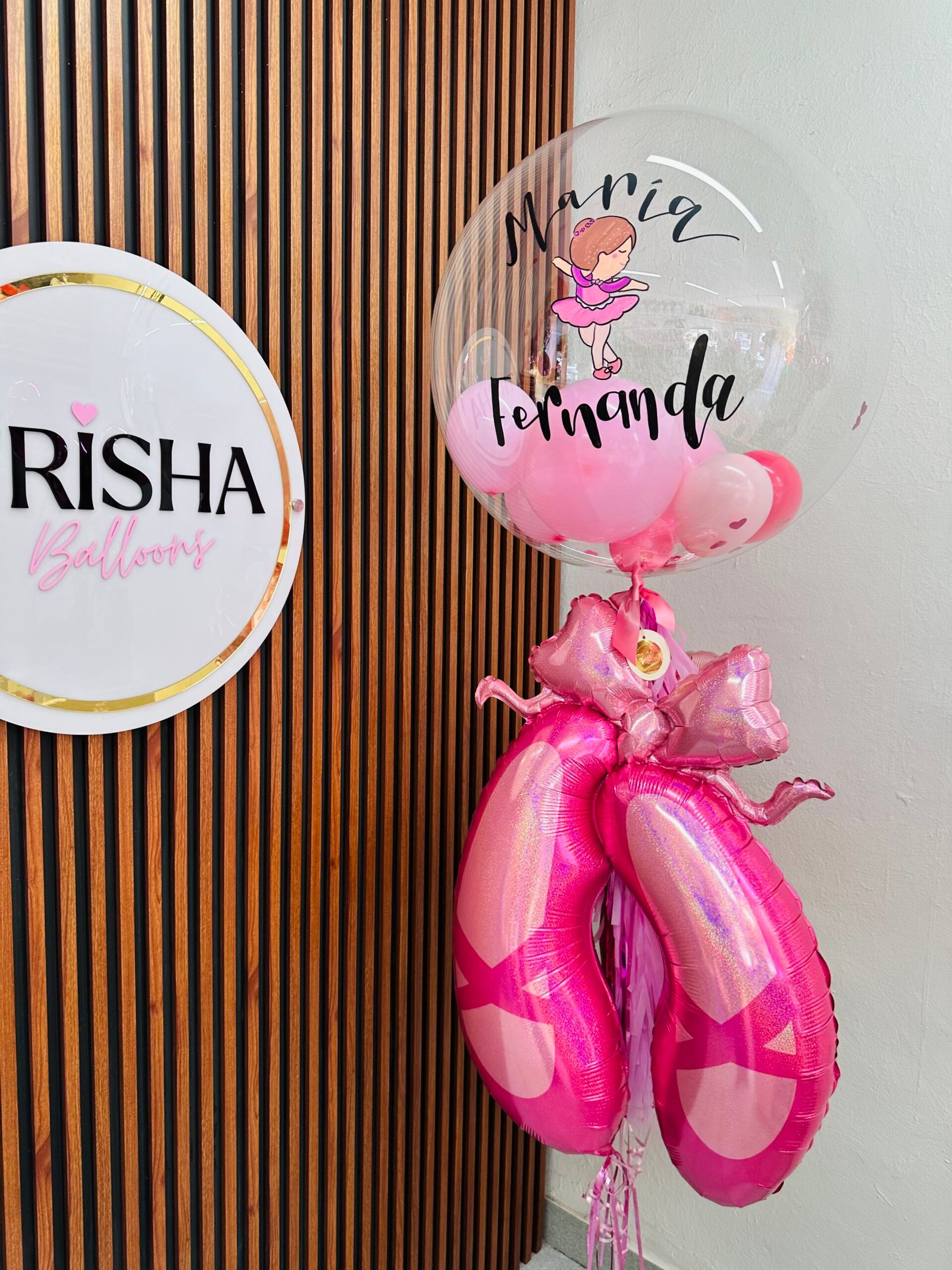 Burbuja personalizada con dibujo pintado a mano con confeti y globos latex dentro, globo foil zapatillas 36″