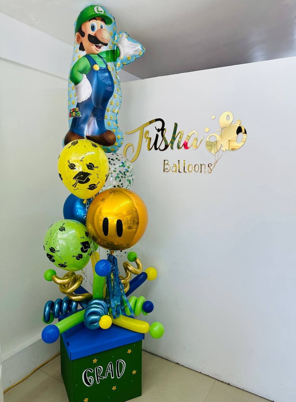 Caja 60×60 personalizada adaptada algun tema o personaje, bouquet con personaje 36″, 1 orbz 15″ y 5 latex, tapa decorada con globo 260 y espirales