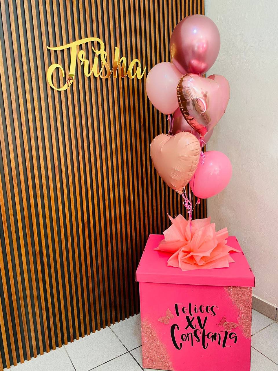 caja personalizada 75×75 con moño en papel y bouquet helio 2 corazones 18″ y 4 latex, incluye relleno de globos látex y papel