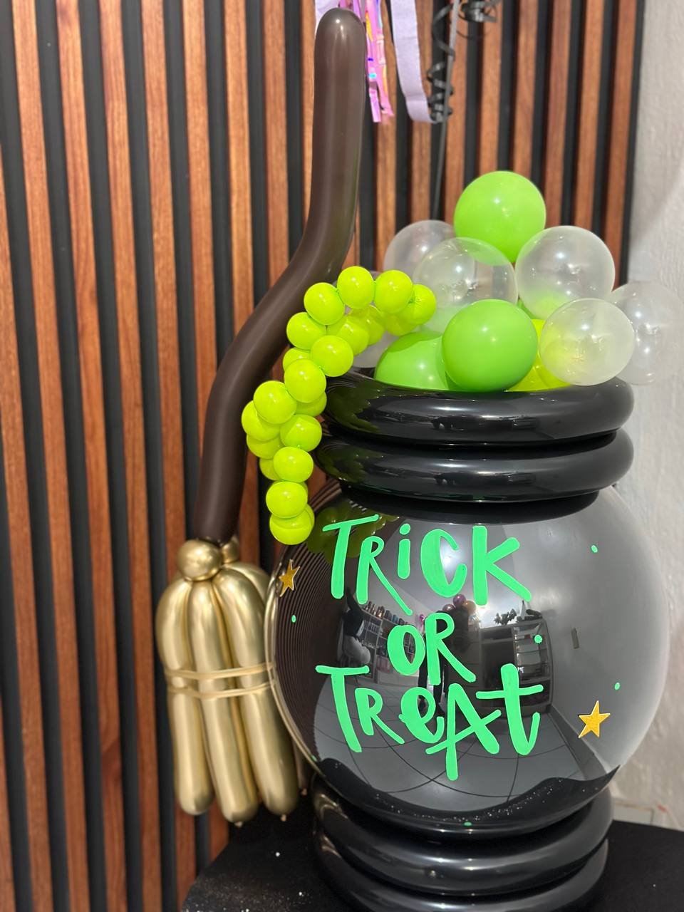 englobado caldero tematica halloween con dulces y confeti dentro, detalle de escoba hecha de globo 260