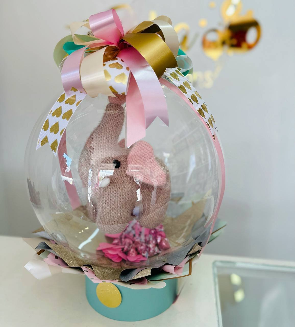 Englobado burbuja con peluche (S) base rigida, con chololates dentro, moño tamano (M) (peluche varia segun existencia)